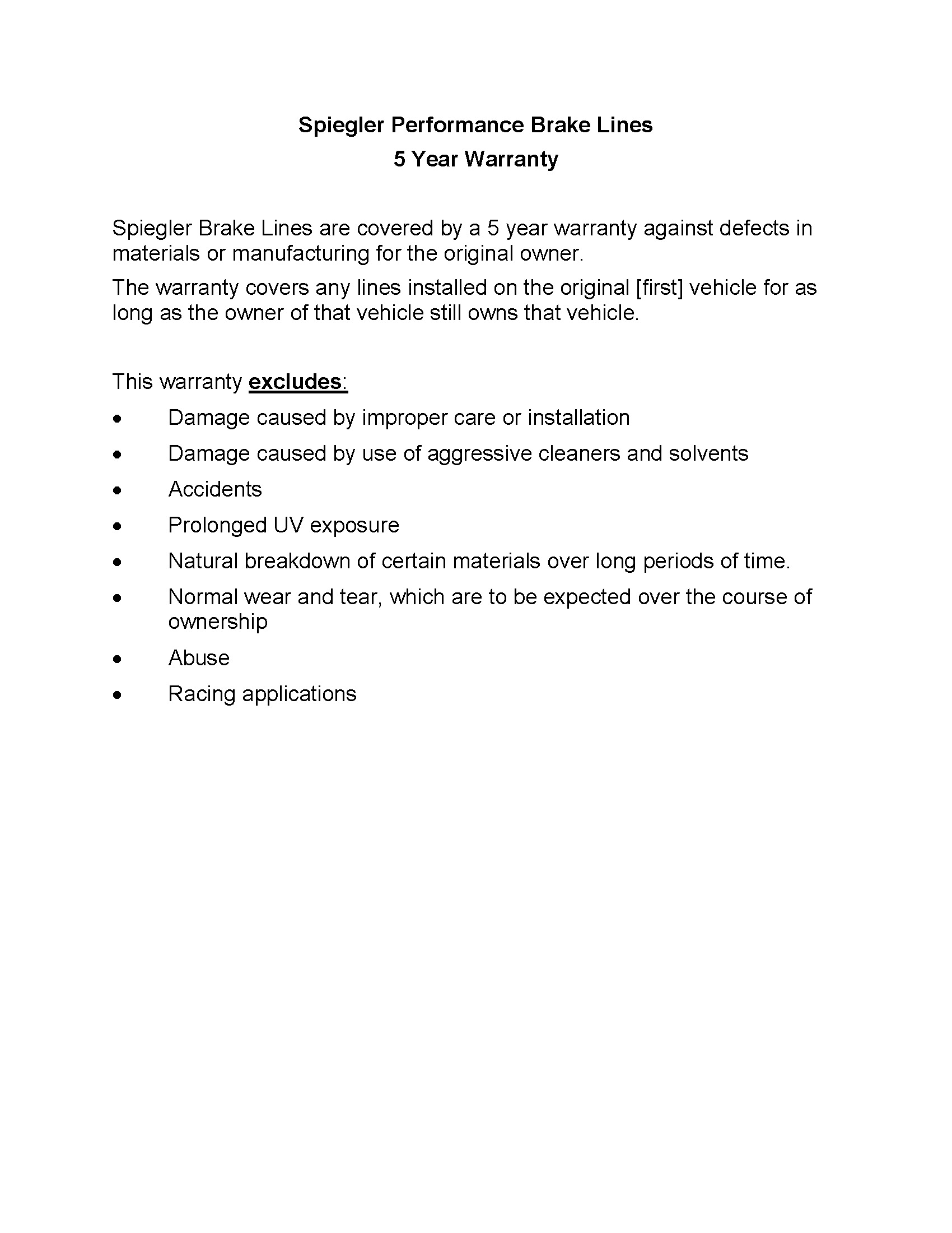 - 5 Year Warranty (The warranty covers any lines installed on the original [first] motorcycle [vehicle] for as long as the owner of that motorcycle [vehicle] still owns that motorcycle [vehicle].)